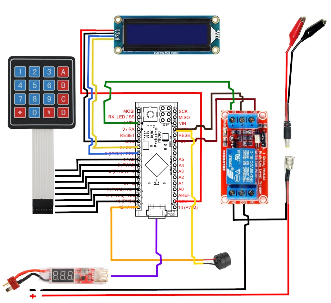 Die Kokodilklemmen werden zum "Detonieren" kurz bestromt, damit eine "Explosion" simuliert werden kann. (Mit Hilfe einer Lampe oder Ähnliches)